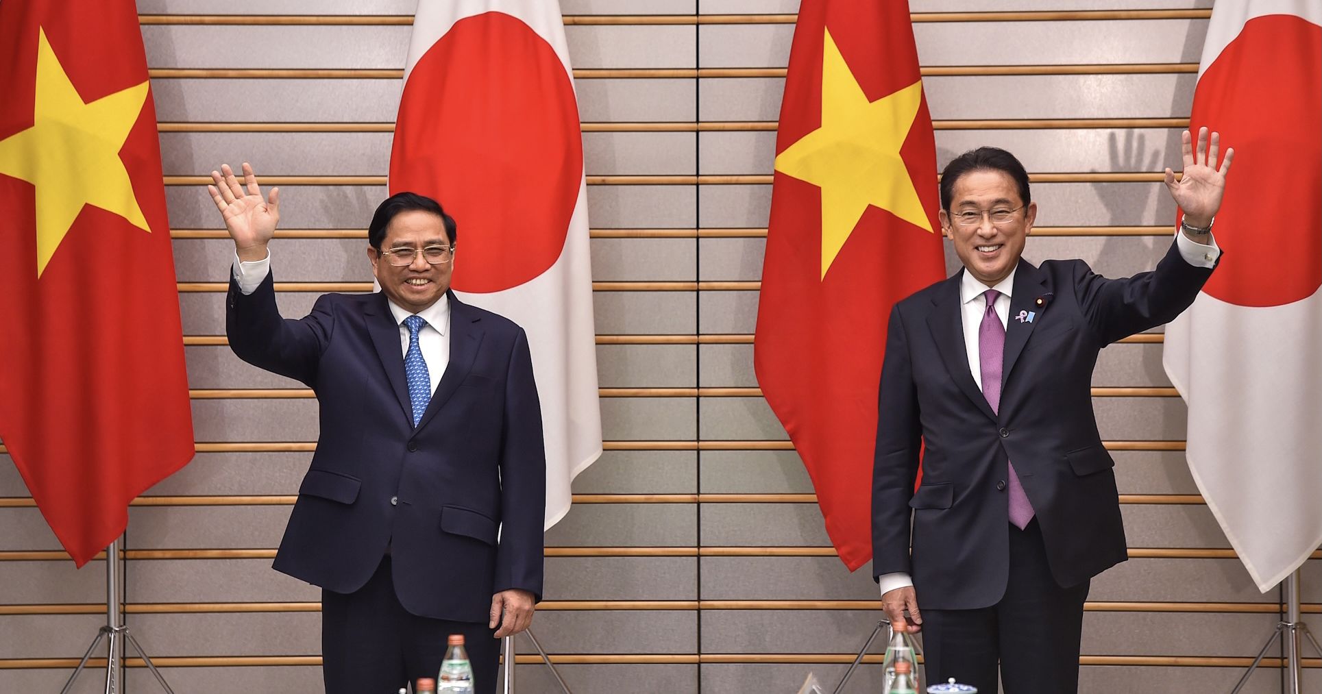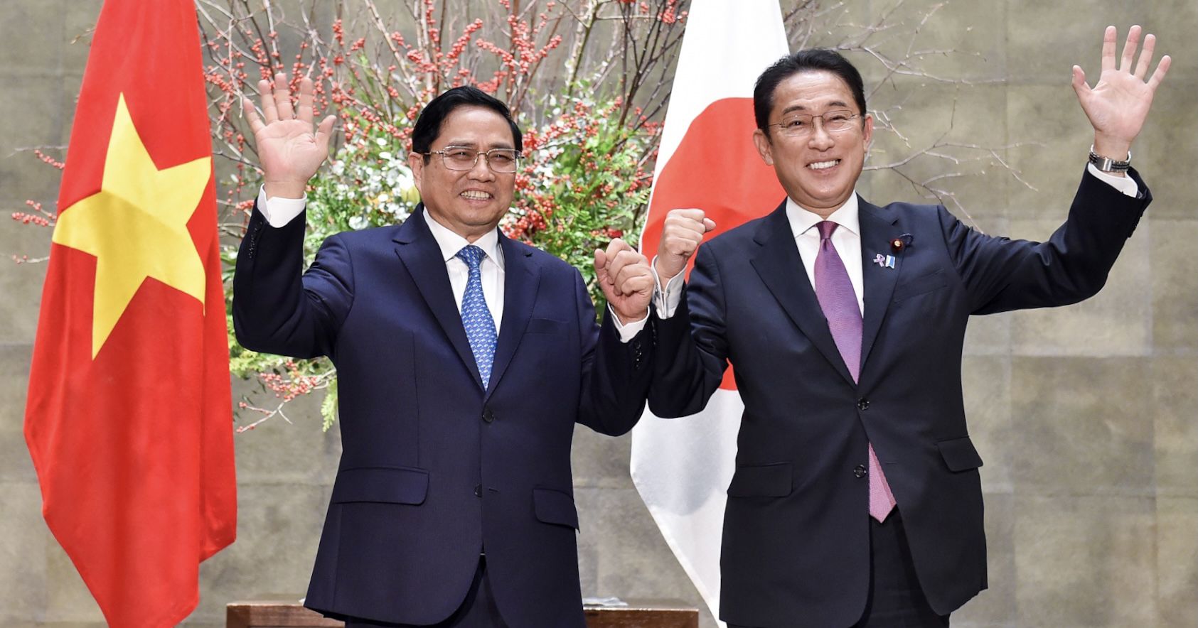 在范明正总理率领的越南高级代表团正式访日时所举行的会晤中,双方对两国关系在各领域取得全面、强劲、务实进展表示欢迎,对日本和越南是共享许多战略利益的重要合作伙伴予以肯定。双方相信,越日广泛战略伙伴关系进一步深入发展的前景广阔。日本就越南对地区乃至国际问题的建设性贡献与作用日益增多予以肯定,就越南对日本的印度洋-太平洋地区外交政策的作用予以肯定。越南强调日本是其重要且长久的合作伙伴,并希望日本继续对地区乃至国际问题扮演着积极、建设性的角色。