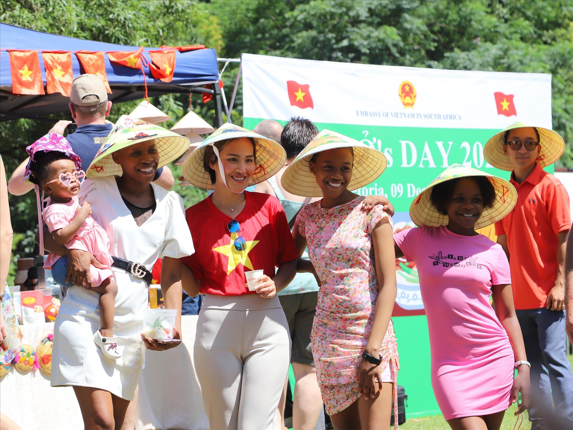 2023年南非越南河粉日活动上,南非朋友们兴致勃勃地戴着越南尖顶帽拍照留念。(图片来源:越通社)
