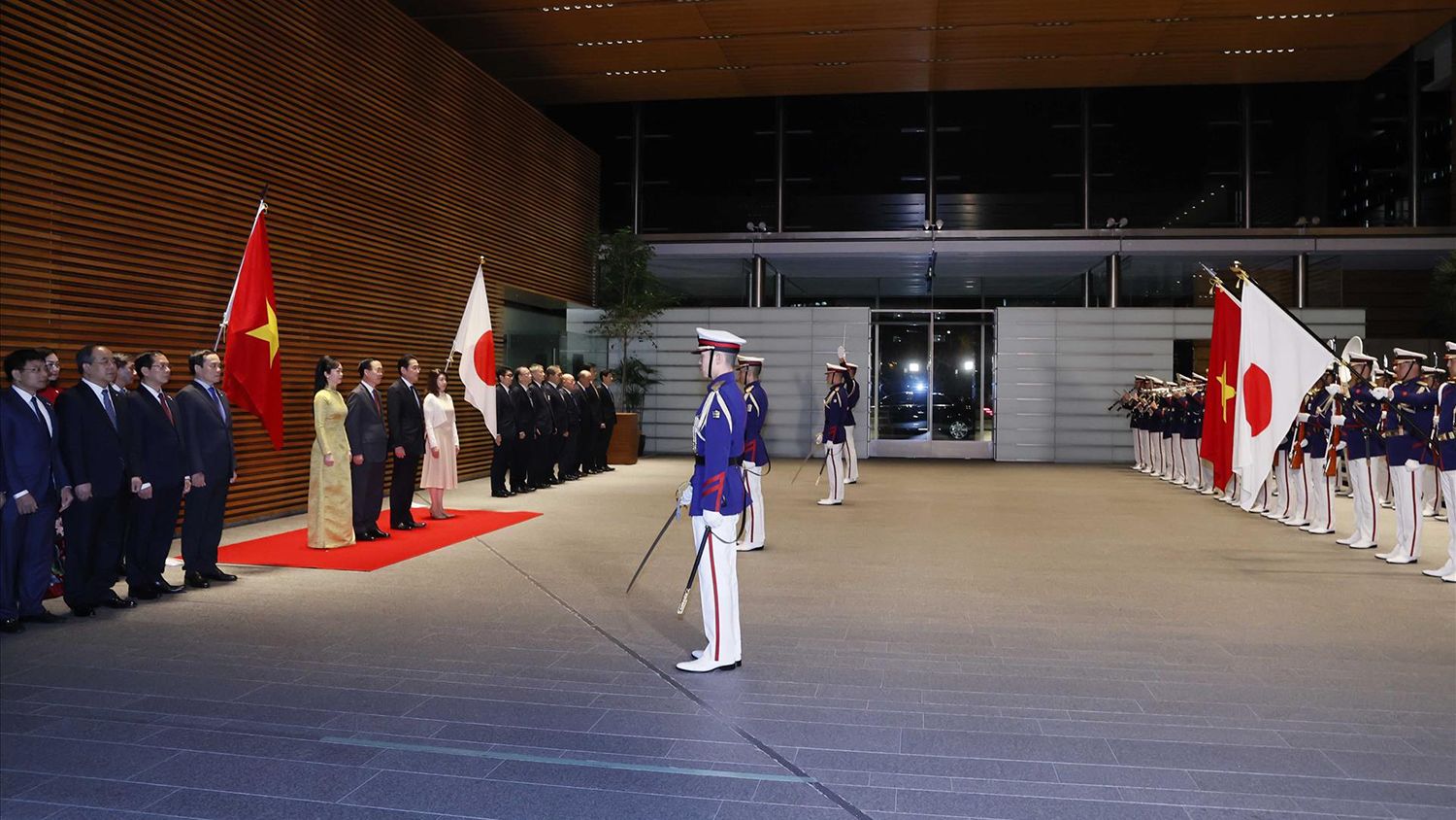 越南国家主席武文赏和夫人及越南高级代表团对日本进行正式访问的欢迎仪式现场。(图片来源:越通社)