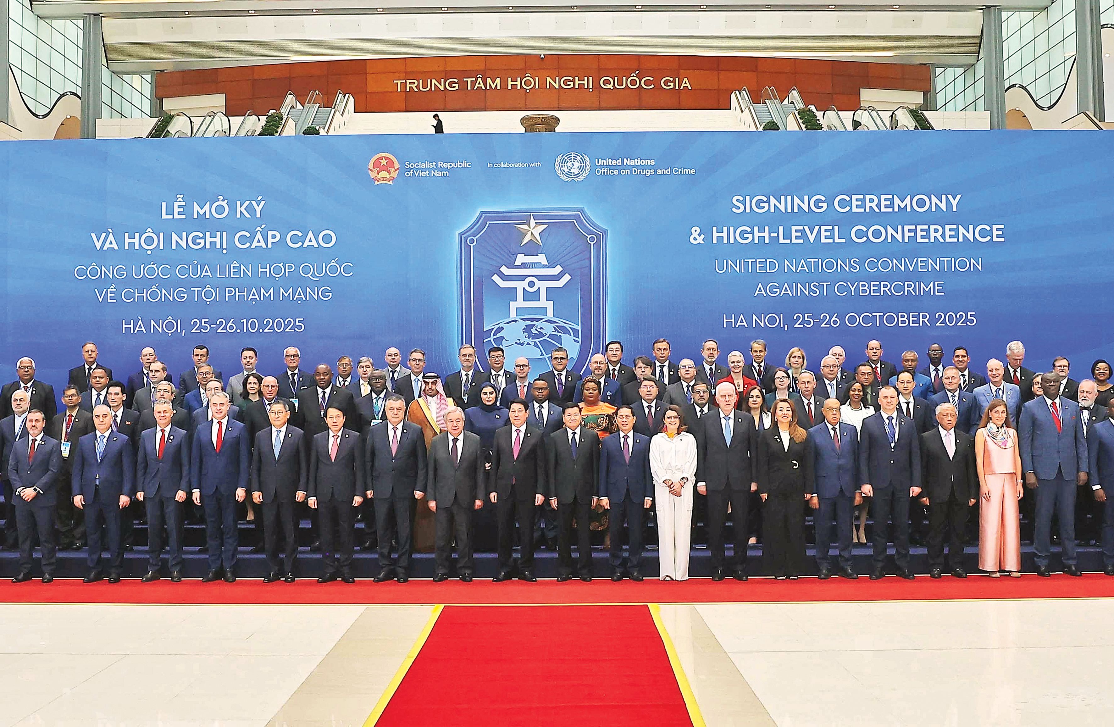 国家主席梁强与联合国秘书长安东尼奥·古特雷斯同出席《河内公约》开放签署仪式的各代表团团长合影。