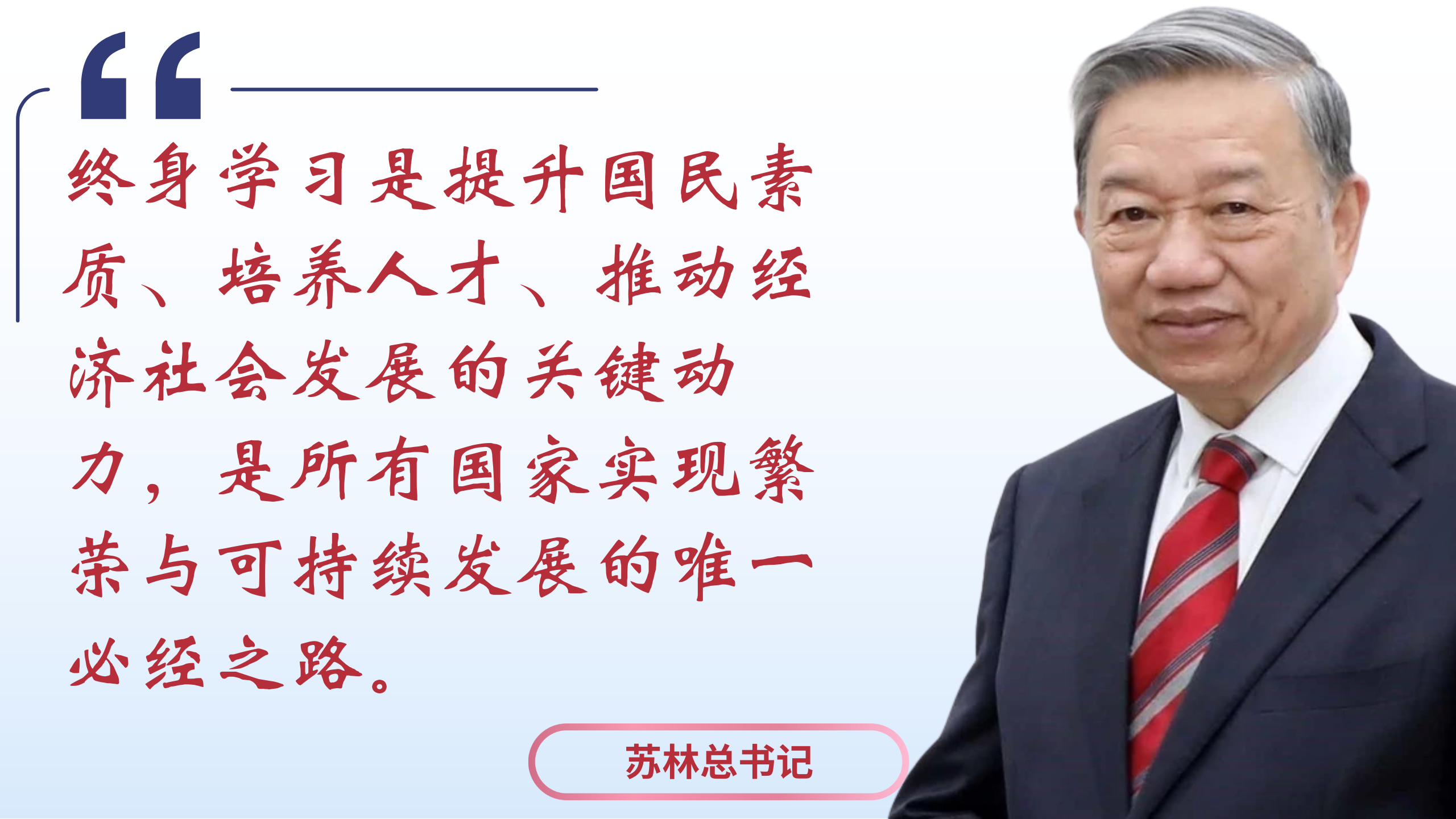 每位公民应当不断学习政治理论、专业知识、业务技能、工作方法、实践经验以及团队协作能力,以提高组织纪律性、提升劳动生产率并发挥整体合力;每位干部、党员应学习革命干部的素质,向书本学习,向彼此学习,向人民学习;不断自学、自我更新知识,积极参与“数字学习”运动,普及和提升科技、数字知识;积极宣传、动员家人、亲属及社会成员进行终身自学。通过终身学习,才能完成党、革命和人民赋予的一切任务。