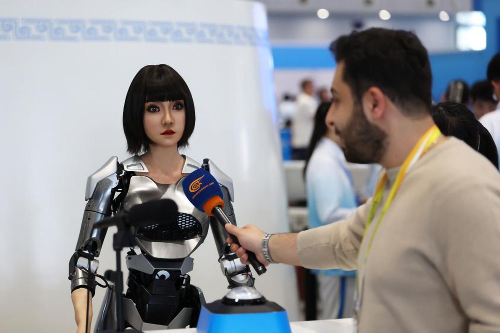 一名外国记者在2025年上海合作组织峰会新闻中心采访机器人。(图片来源:新华社)