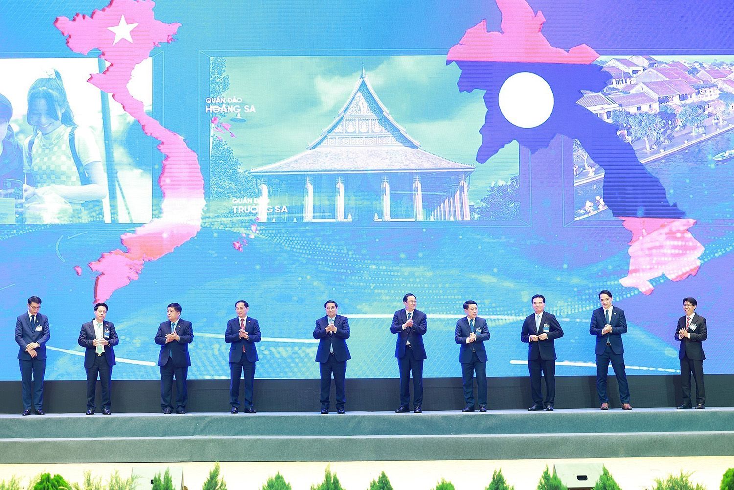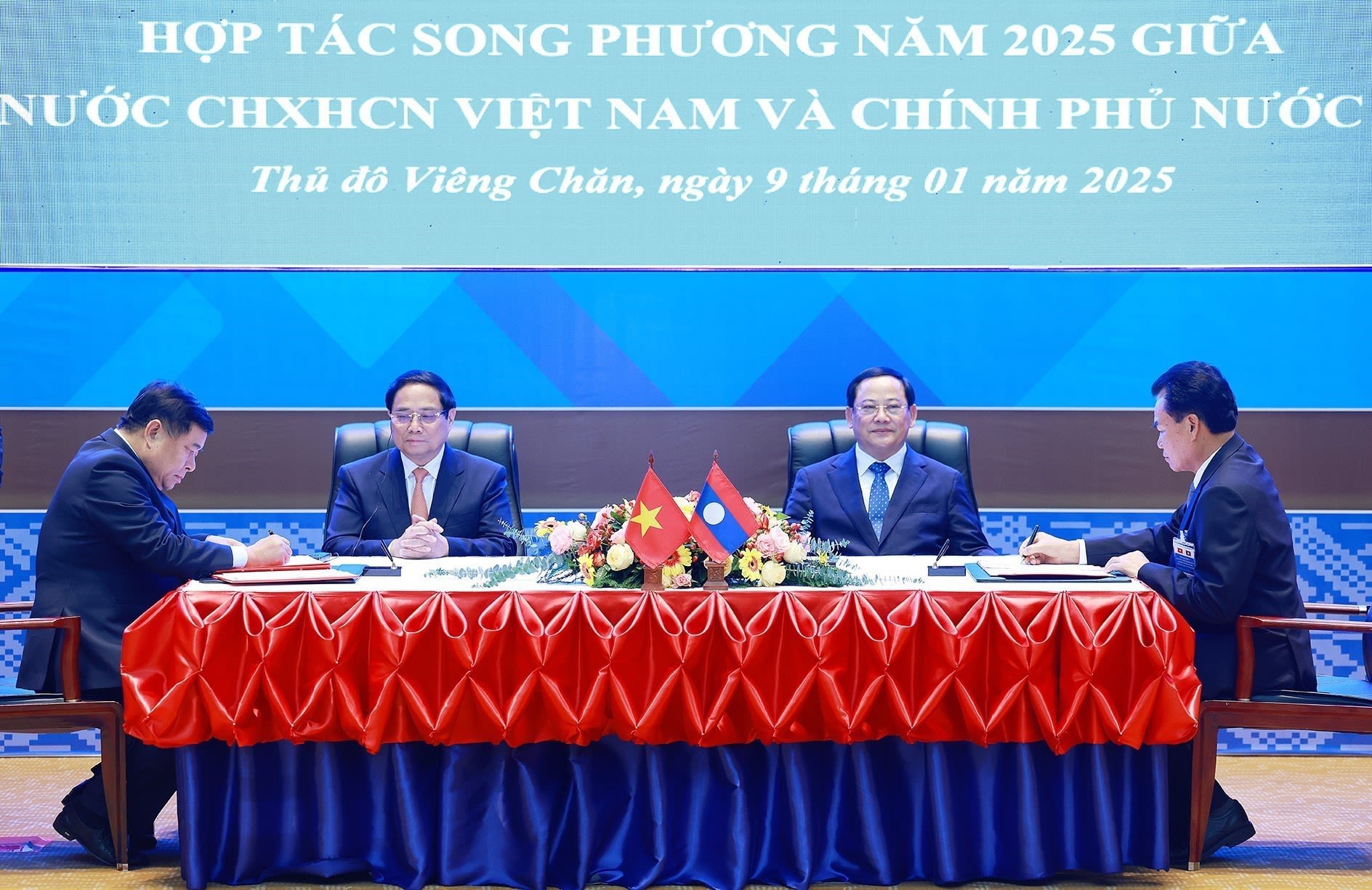 2025年1月9日,越南政府总理范明正与老挝政府总理宋赛·西潘敦出席在老挝万象举办的越老跨境二维码支付链接和本币支付框架的公布仪式。(图片来源:越通社)