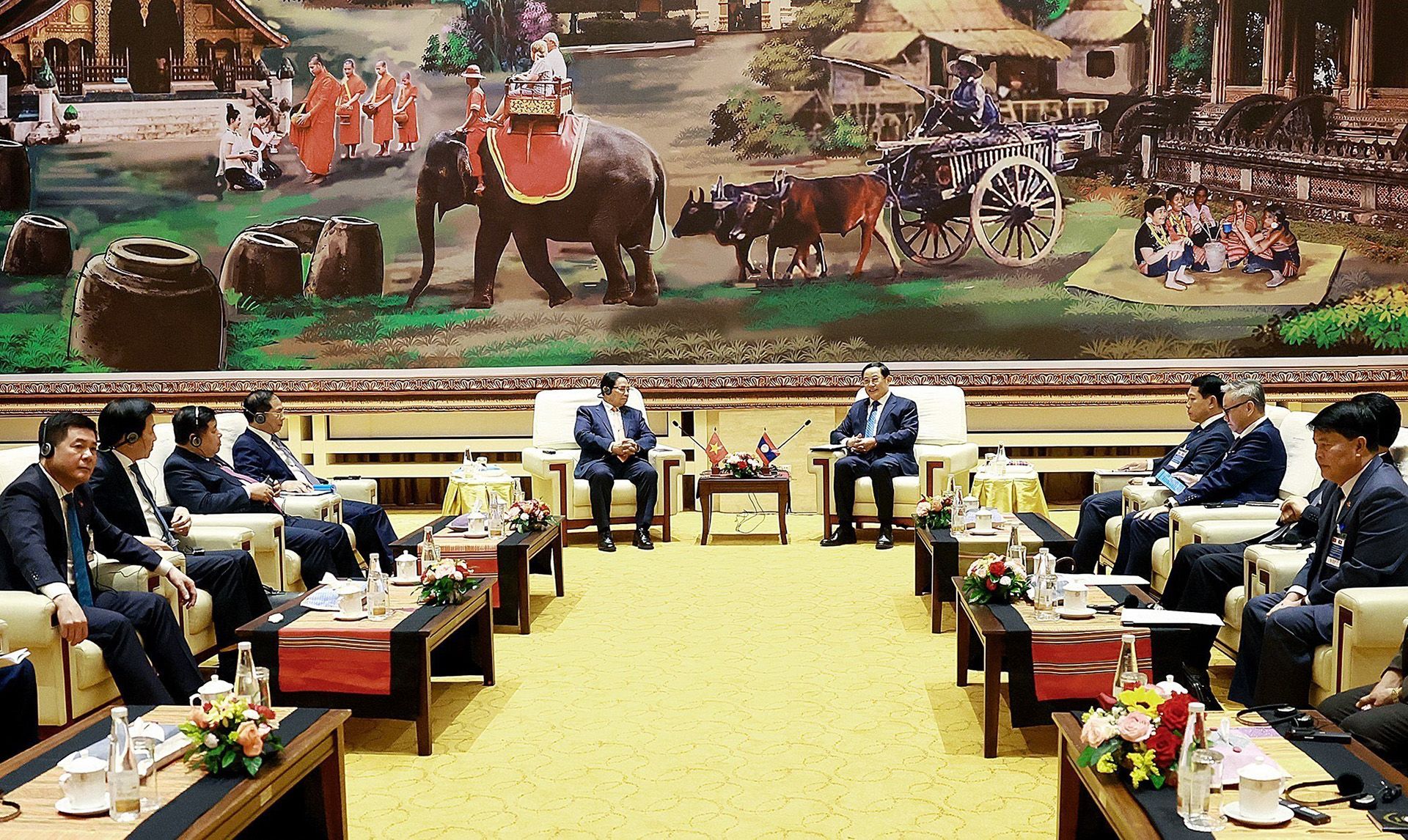 在访问老挝并共同主持越老两国政府间委员会第47次会议期间,越南政府总理范明正于2025年1月9日在首都万象与老挝政府总理宋赛·西潘敦举行小范围会晤。(图片来源:越通社)
