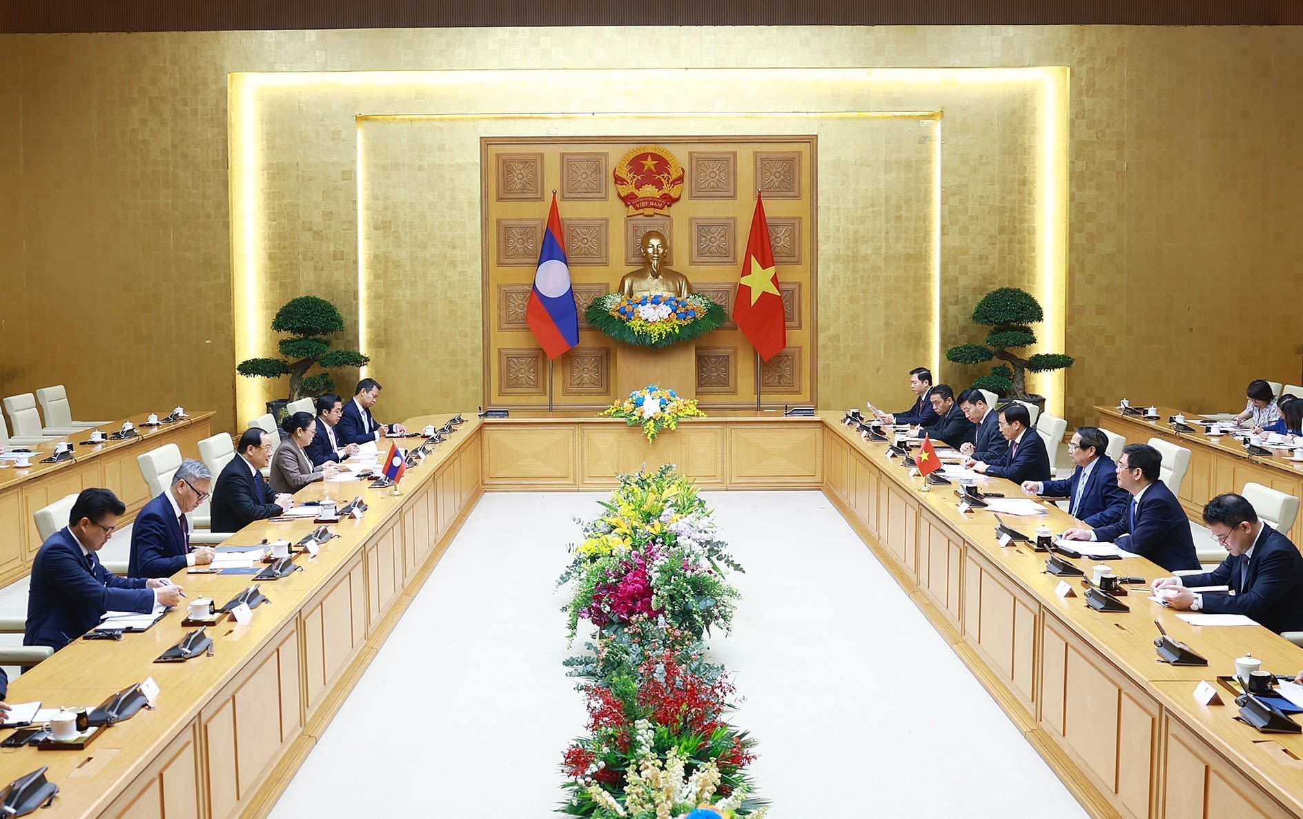 越南政府总理范明正同自2025年4月14日至17日赴越南出席第四届绿色增长与全球目标伙伴2030年峰会(P4G)的老挝政府总理宋赛·西潘敦举行会谈。(图片来源:越通社)