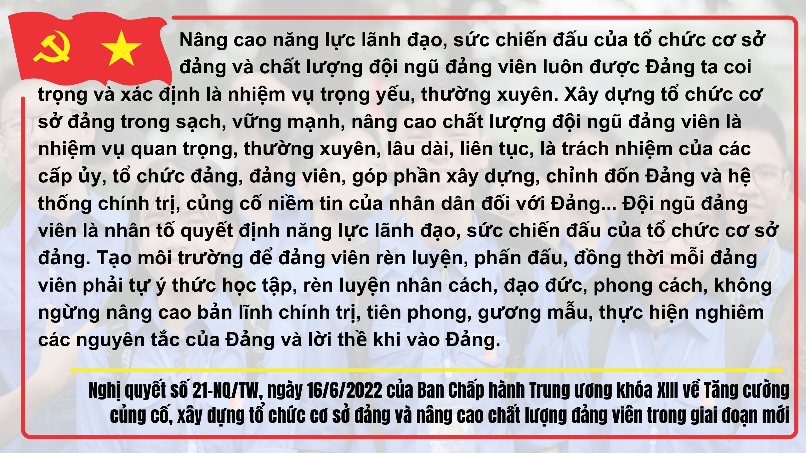 Chủ tịch Hồ Chí Minh đã chỉ rõ: “Đảng là gồm các đảng viên mà tổ chức nên. Mọi công việc của Đảng đều do đảng viên làm. Mọi nghị quyết của Đảng đều do đảng viên chấp hành. Mọi chính sách của Đảng đều do đảng viên mà thấu đến quần chúng. Mọi khẩu hiệu, mọi kế hoạch của Đảng đều do đảng viên cố gắng thực hiện” . Người nhấn mạnh: “Để lãnh đạo cách mạng, Đảng phải mạnh. Đảng mạnh là do chi bộ tốt. Chi bộ tốt là do các đảng viên đều tốt” . Bởi vậy, hơn bao giờ hết, đất nước ta đang bước vào thời kỳ phát triển mới, kỷ nguyên mới - kỷ nguyên vươn mình của dân tộc Việt Nam, để xây dựng, chỉnh đốn Đảng trong sạch, vững mạnh, hoàn thành trọng trách to lớn đối với đất nước, trước hết cần xác định việc hệ trọng của Đảng hiện nay là nâng cao năng lực lãnh đạo, sức chiến đấu của các tổ chức Đảng và xây dựng đội ngũ đảng viên chất lượng chính là cốt lõi để xây dựng Đảng trong sạch, vững mạnh.