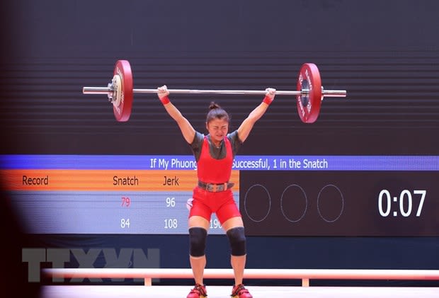 越南举重运动员孔美凤在女子45公斤级比赛中以80公斤的成绩刷新了东运会抓举纪录。(图片来源:越通社)