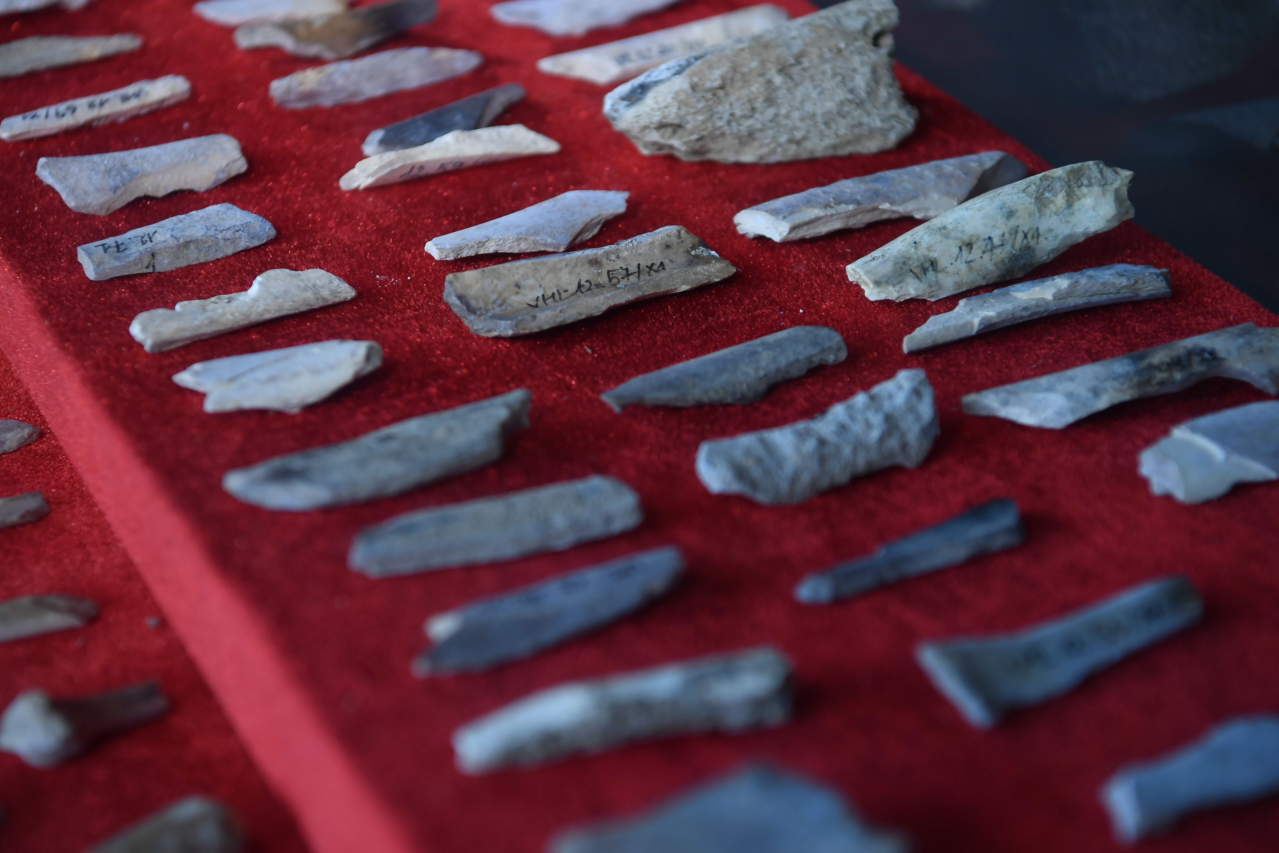 考古发掘的若干劳动工具在仙翁洞展示。