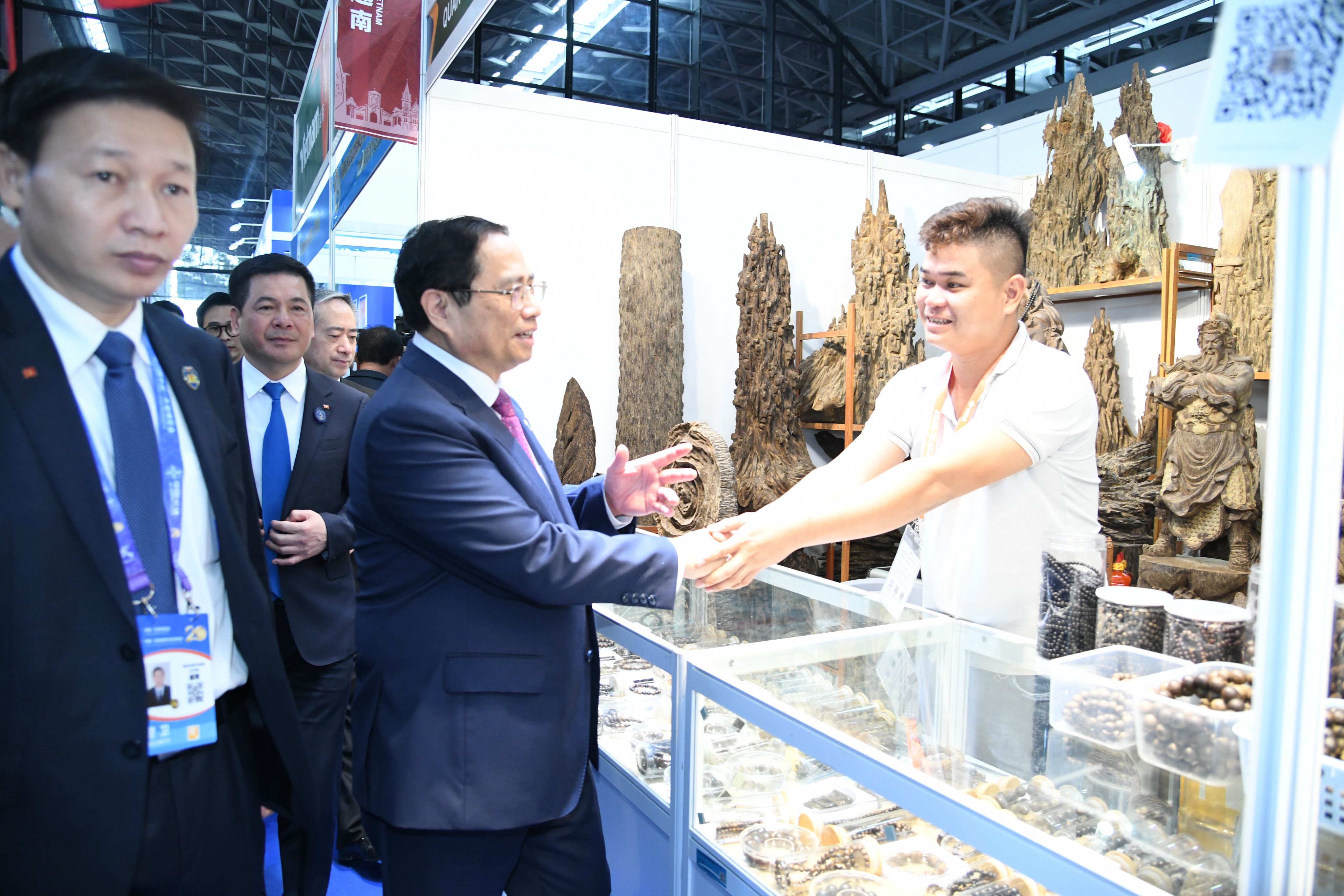 越南政府总理范明正参观参加第20届中国—东盟博览会的越南企业展位之一。(图片来源:人民报网)