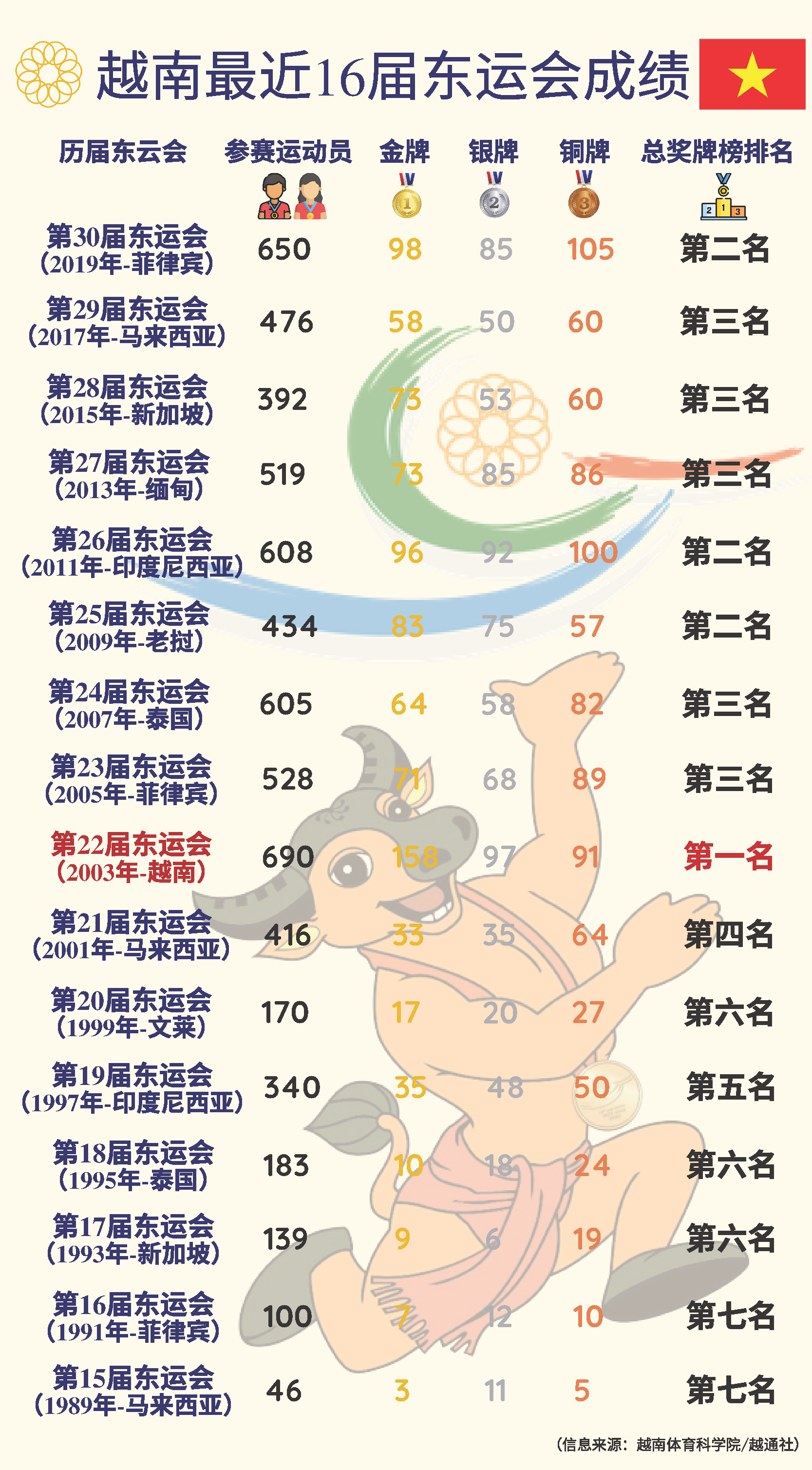 在第15届、16届东运会上,越南体育代表团在总奖牌榜上名列第7位,到2001年在马来西亚举办的第21届东运会上,越南体育代表团在总奖牌榜上则排名第4位。除了在2003年第22届东运会上以东道主的身份共夺得156枚金牌、91枚银牌和93枚铜牌在总奖牌榜上高居首位以外,越南体育代表团在2009年由老挝举办的第25届东运会上以83枚金牌、75枚银牌和57枚铜牌的成绩在总奖牌榜上名列第二位。
