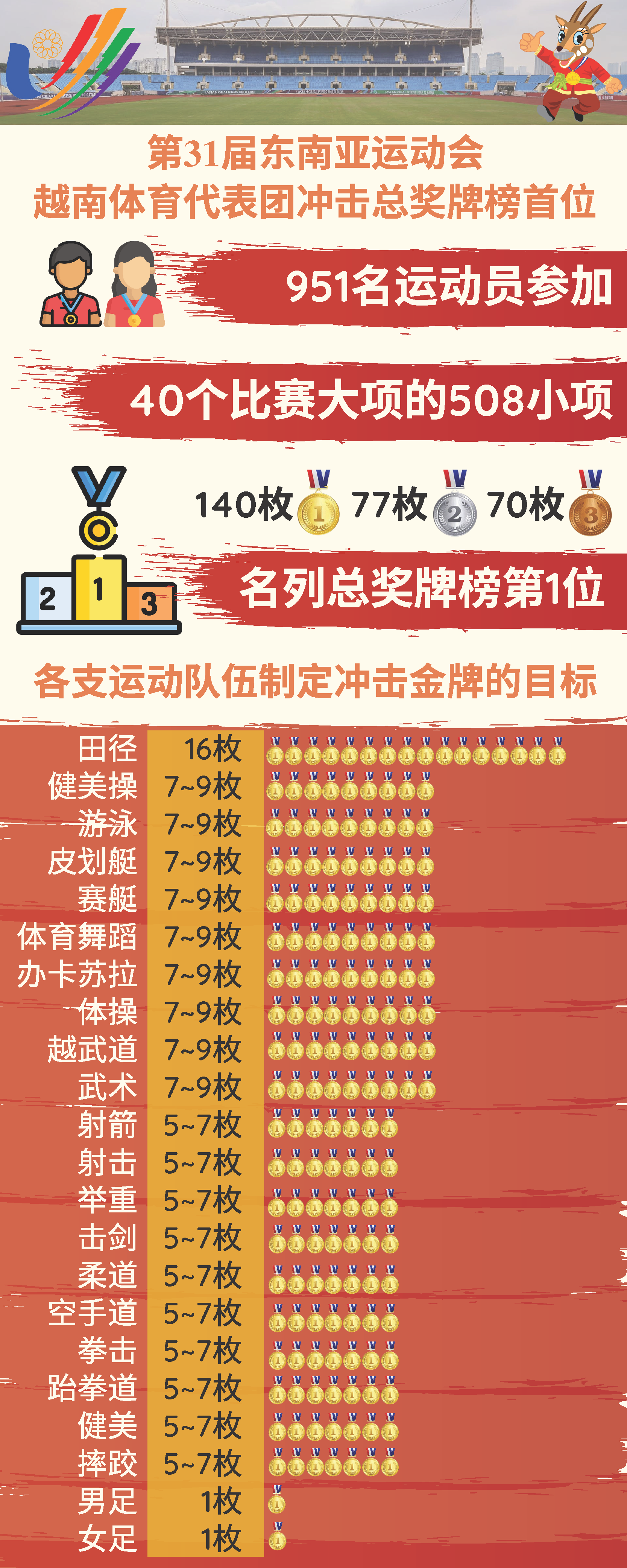 越南第31届东运会体育代表团是由1341名成员组成,其中运动员为951名、教练员为250名、专家为30名、各运动队伍负责人46名。越南运动员在第31届东运会的40个比赛大项的508个小项参加角逐,并将目标锁定在冲击140多枚金牌以在总奖牌榜上名列首位。尤其是,越南U23男足队和女足队双双力争卫冕冠军。
