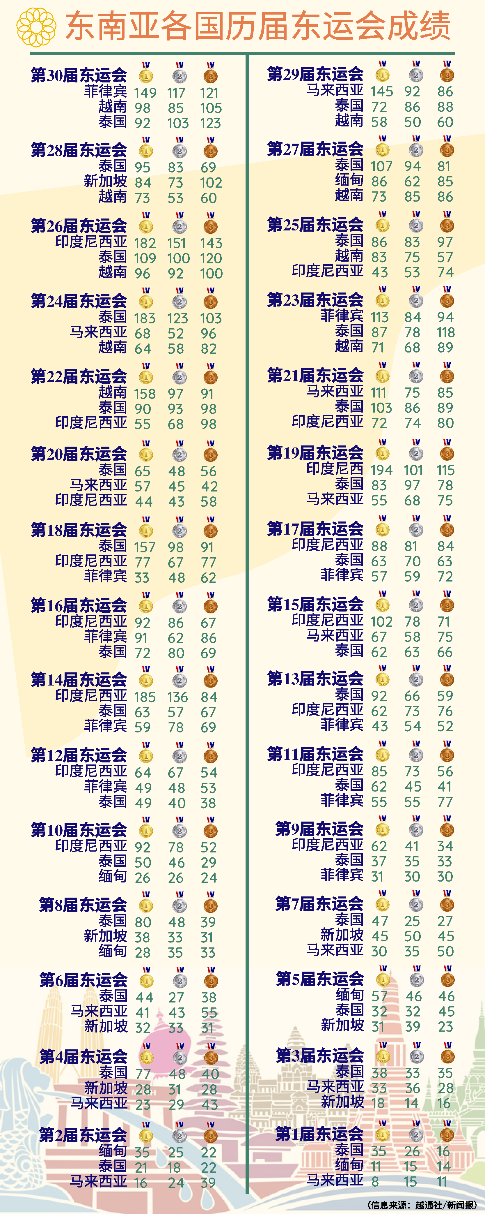 东南亚运动会(SEA Games)是东南亚地区在亚洲奥林匹克理事会(OCA)和国际奥林匹克委员会(IOC)的监督下举行规模最大的综合体育运动。目前,东运会共有越南、老挝、柬埔寨、泰国、缅甸、马来西亚、新加坡、印度尼西亚、文莱、菲律宾和东帝汶11个东南亚国家参赛。