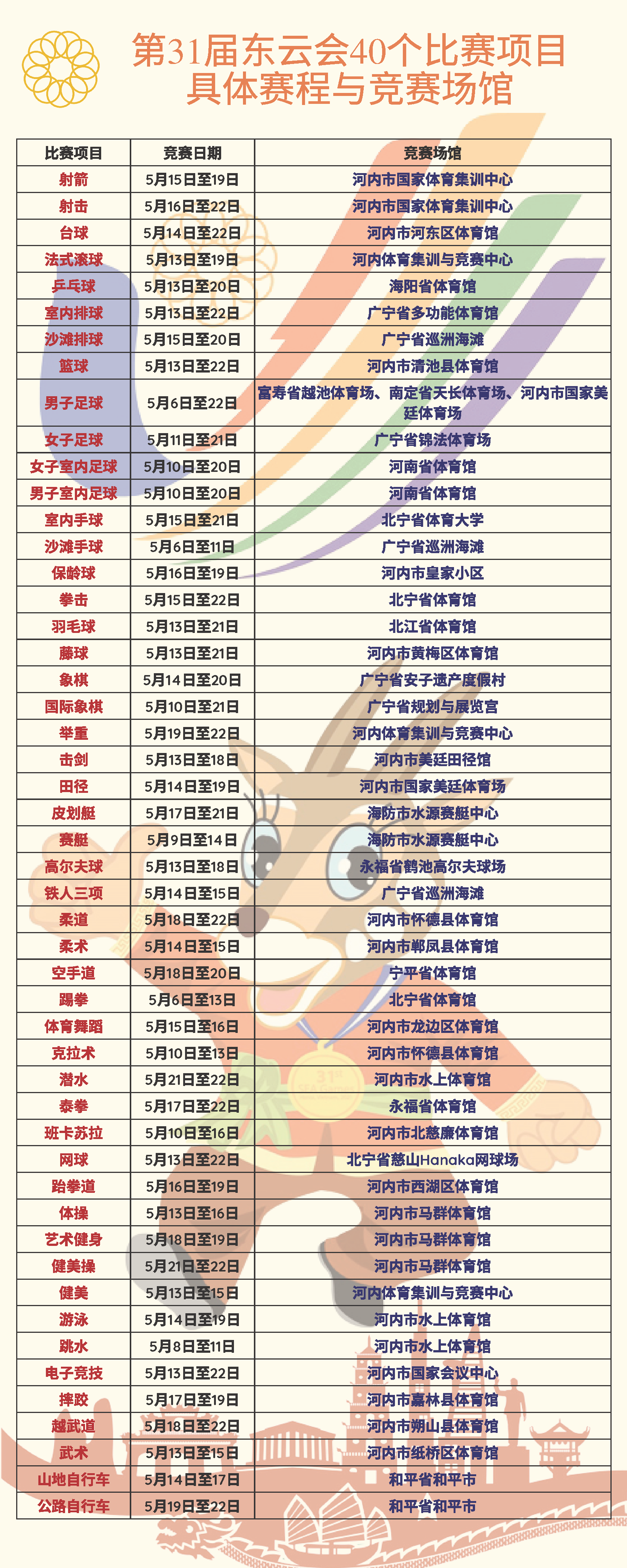 第31届东南亚运动会将于5月12日至23日在河内等12个省市进行。其中,河内市是主办地,本届东运会的开幕式和闭幕式分别于5月12日和23日在美廷体育场和美廷田径馆举行;11个承办省市是北宁省、海阳省、海防市、广宁省、河南省、南定省、宁平省、和平省、永福省、富寿省和北江省。