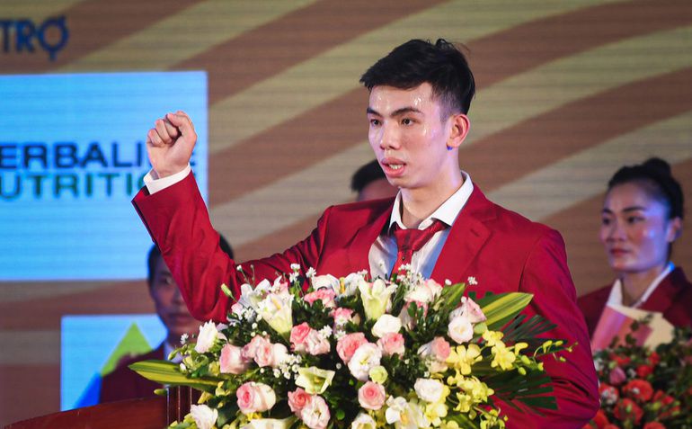 越南游泳健儿阮辉煌在越南体育代表团第31届东南亚运动会出征仪式上代表运动员宣誓。