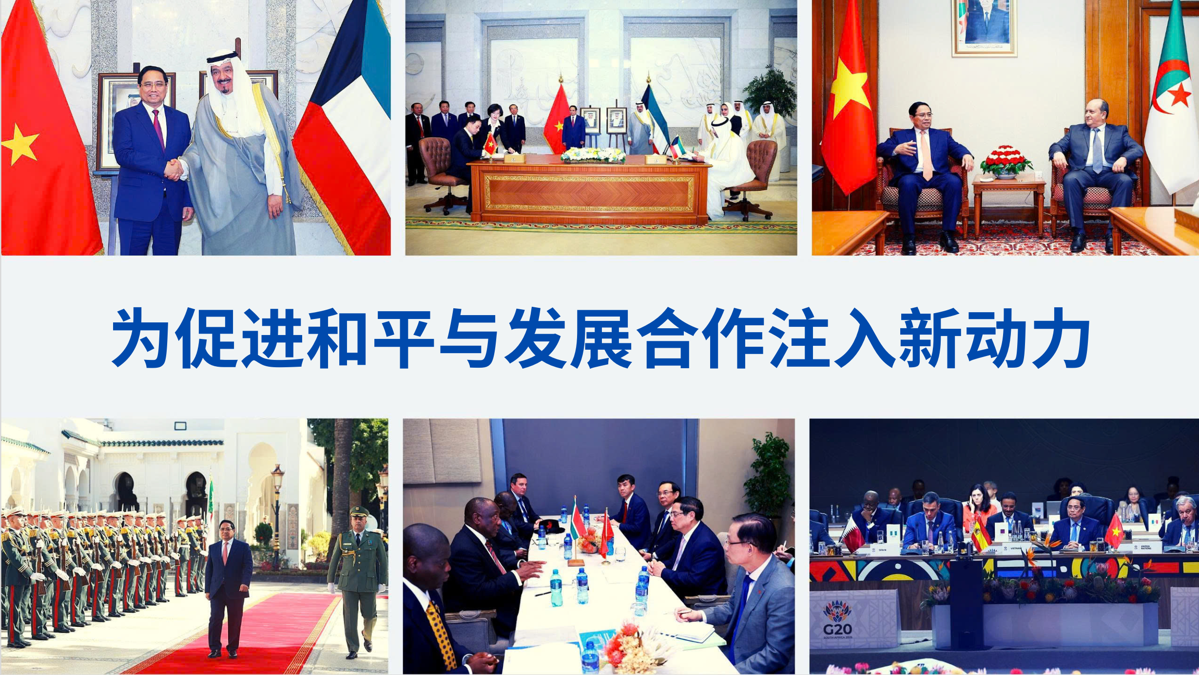 越南政府总理范明正与夫人及越南高级代表团圆满结束了从11月16日至24日对科威特和阿尔及利亚进行正式访问,并出席在南非举行的二十国集团(G20)峰会及多项双边活动之行。范明正总理此次工作访问期间,越南与科威特、阿尔及利亚、南非分别发表关于建立战略伙伴关系的联合声明被视为历史性里程碑,为推动越南与上述国家之间的友谊和多领域合作迈向更加深入、务实及有效的新阶段注入了新动力。