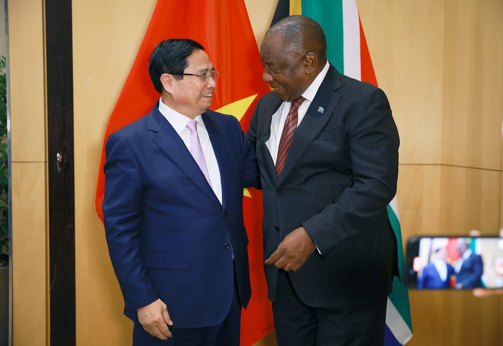 越南政府总理范明正会见南非共和国总统、2025年G20峰会主席马塔梅拉·西里尔·拉马福萨。