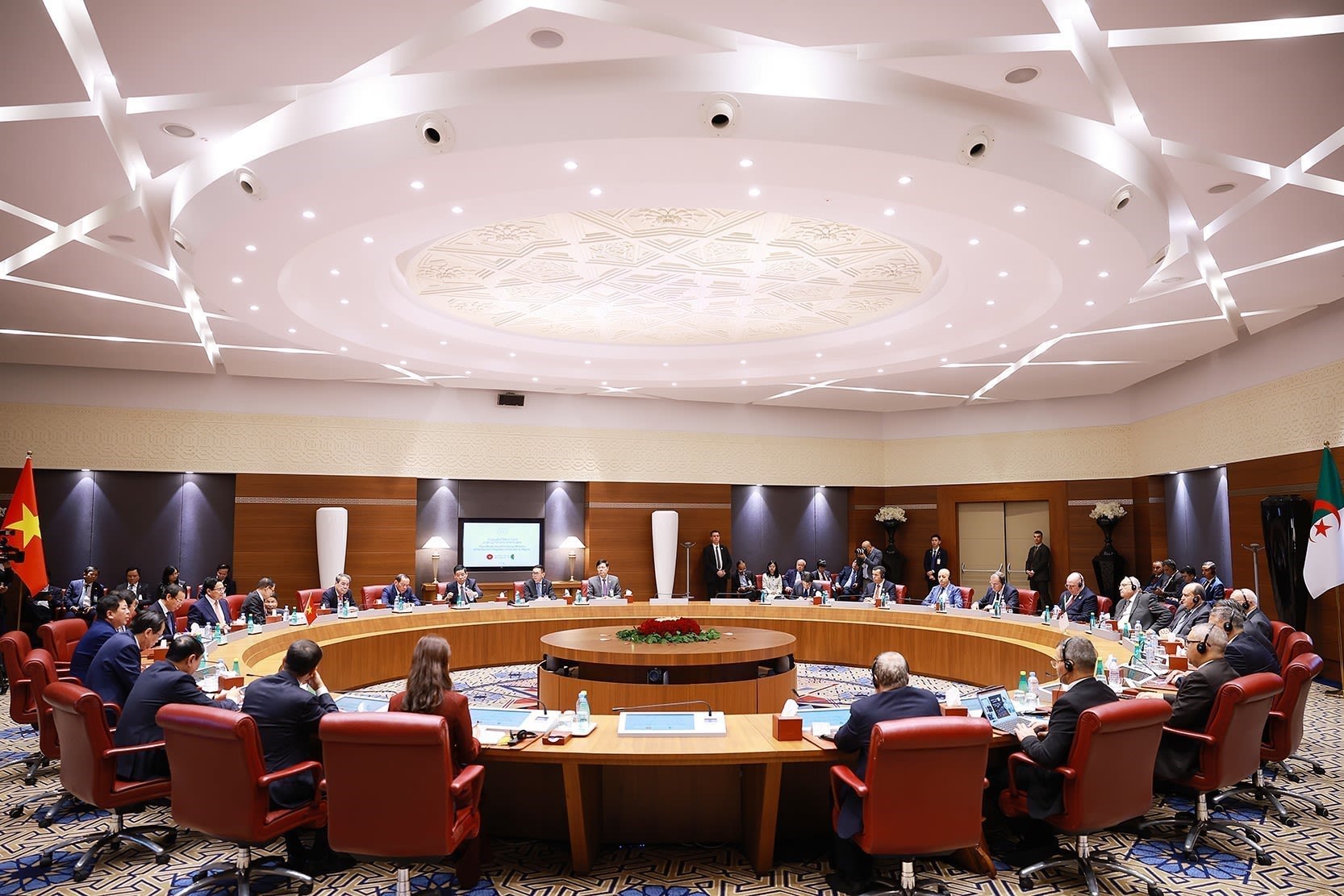 在会见阿尔及利亚国民议会(下议院)议长易卜拉欣·布加利和国民委员会(上议院)议长阿祖兹·纳斯里时,范明正总理希望上议院和下议院能够支持两国政府落实战略伙伴关系框架,包括积极批准已签署的各项协议,特别是关于税收、投资和贸易的协议,并扩大在科技、创新、数字化转型等领域的合作。