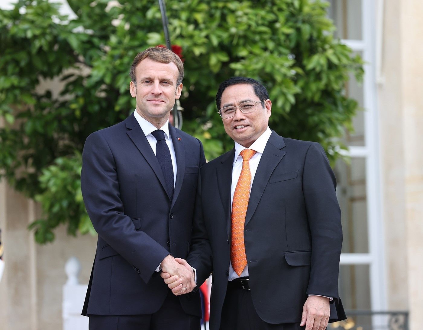 2021年11月4日,法国总统埃马纽埃尔·马克龙和总理范明正在巴黎爱丽舍宫。(图片来源:越通社)