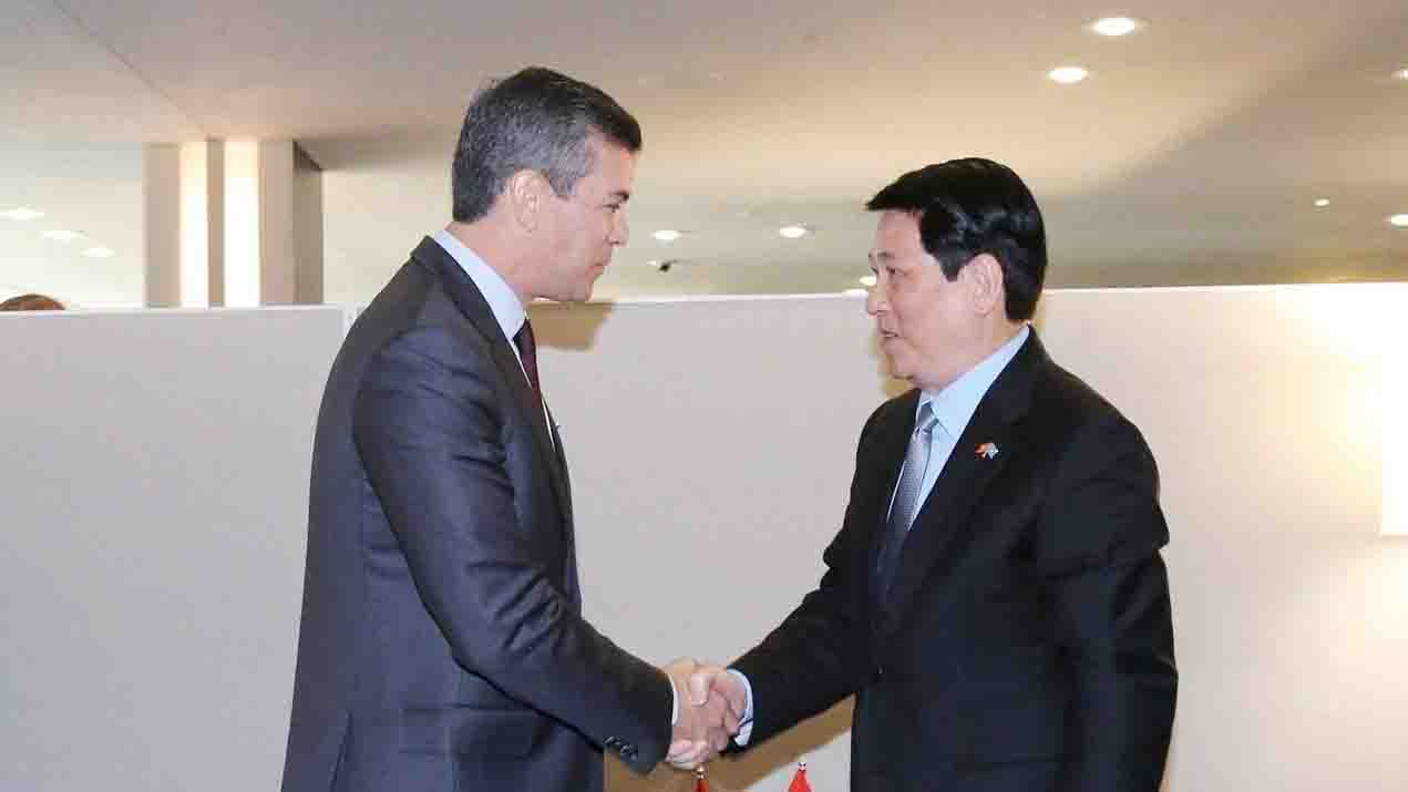 越南国家主席梁强会见巴拉圭总统圣地亚哥·培尼亚·帕拉西奥斯。(图片来源:越通社)