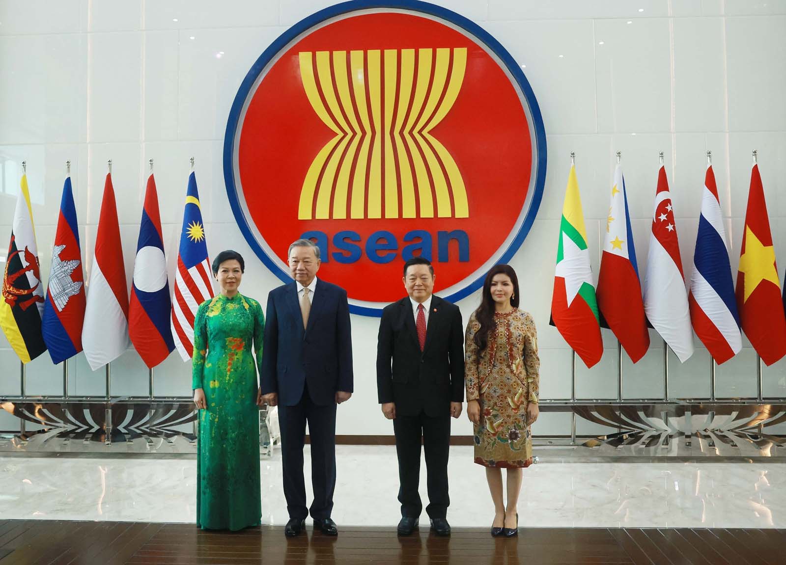 苏林总书记和夫人与东盟秘书长高金洪和夫人在东盟秘书处总部合影。(图片来源:越通社)