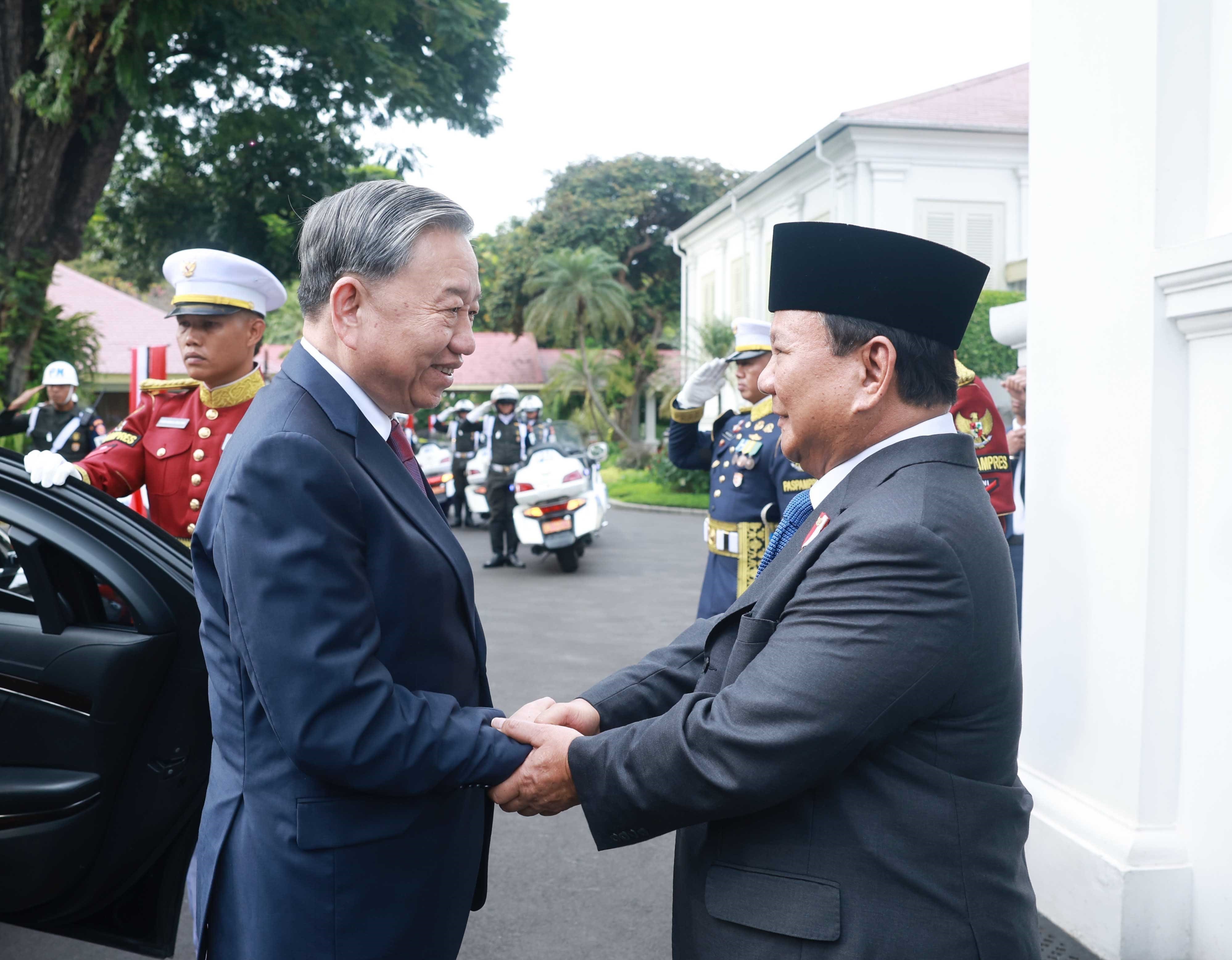印尼总统普拉博沃·苏比安托欢迎苏林总书记对印尼进行国事访问。(图片来源:越通社)