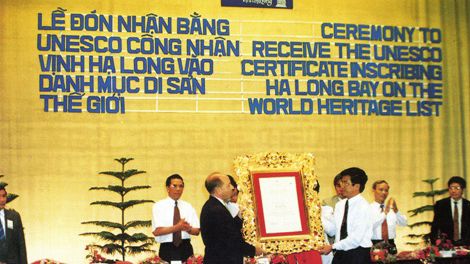 下龙湾首次荣获世界自然遗产证书的仪式。