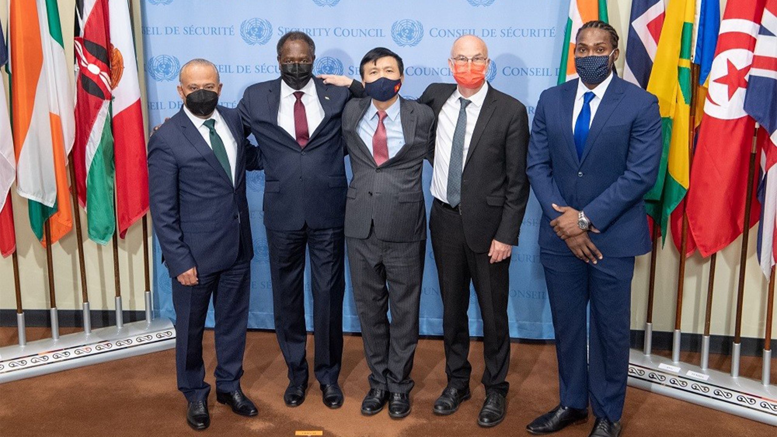 邓廷贵大使与结束2020年至2021年安理会非常任理事国任务的爱沙尼亚、尼日尔、圣文森特和格林纳丁斯、突尼斯四国大使合影留念。(图片来源:越通社)
