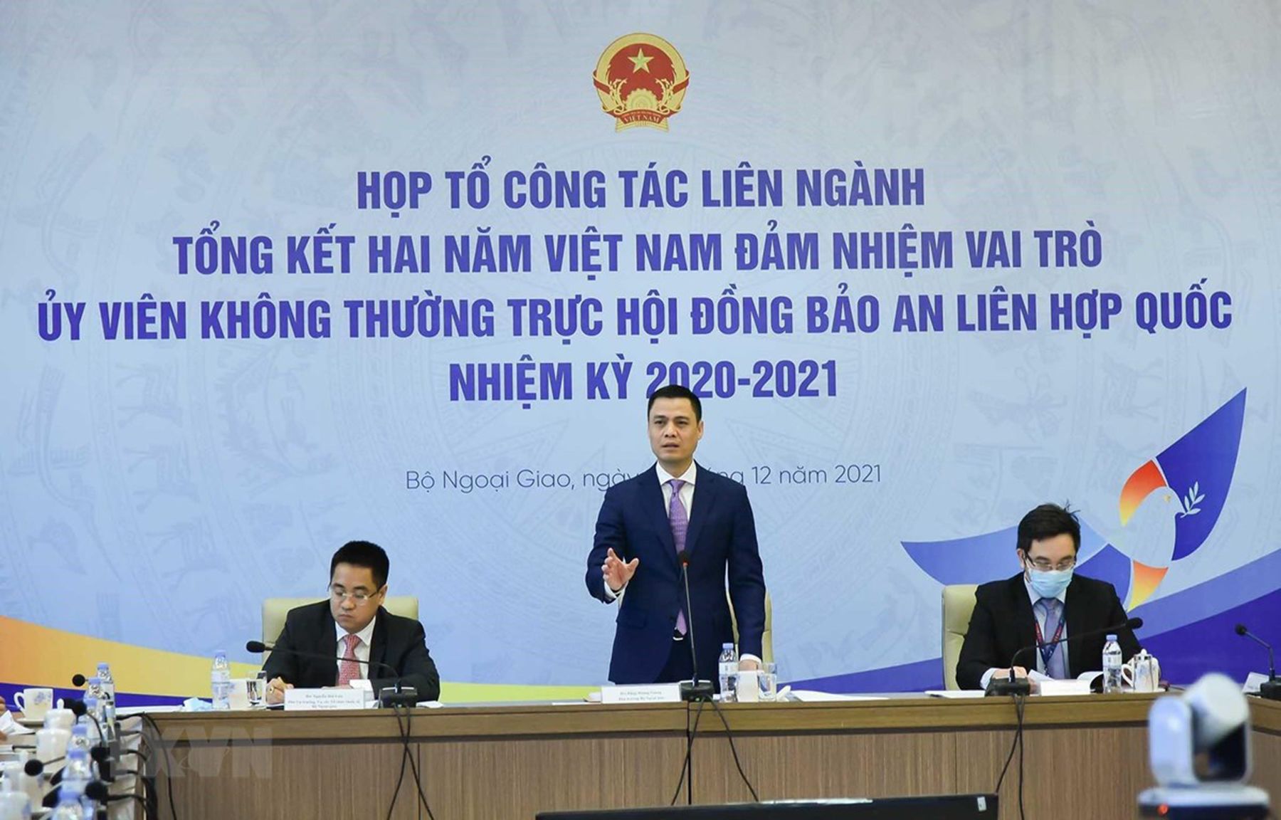 越南担任联合国2020年至2021年安理会非常任理事国联合工作组2021年12月28日召开会议就两年参与联合国安理会的情况与结果进行评估。(图片来源:越通社)