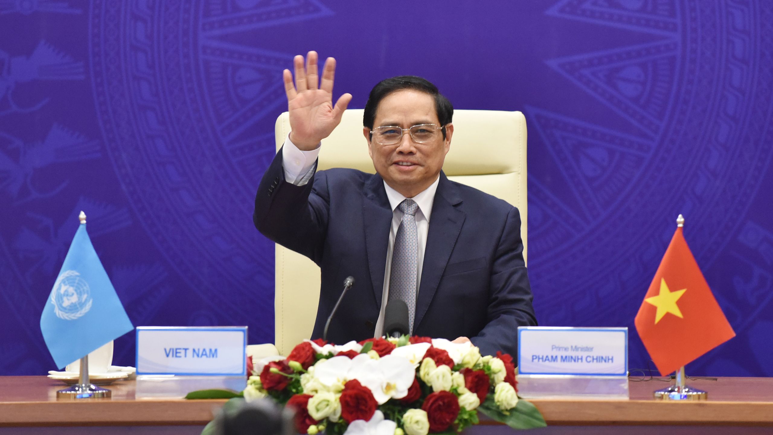 越南政府总理范明正2021年8月9日以视频形式出席联合国安理会的题为“加强海上安全:国际合作中的一个领域”的高级公开辩论会。(陈海 摄)