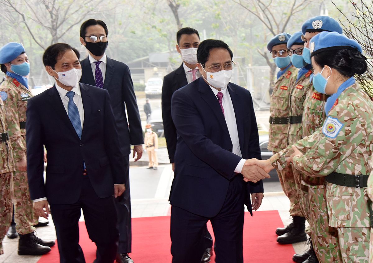 越南政府总理范明正与曾经参加联合国维和部队的越南干部战士握手。(陈海 摄)