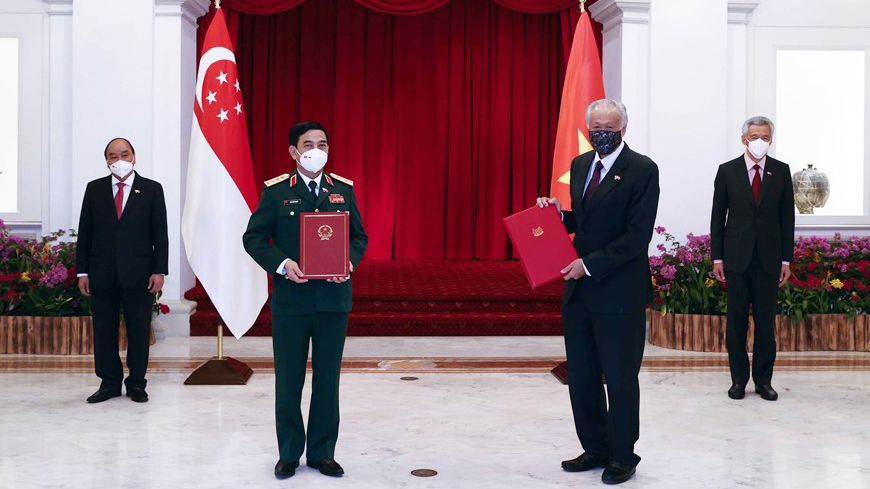 国家主席阮春福和李显龙总理见证两国国防合作协议的签署。