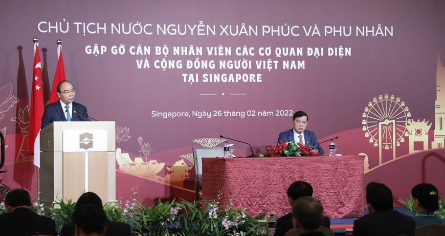 国家主席阮春福与越南驻新加坡大使馆干部职员和旅新越南人社团会面。
