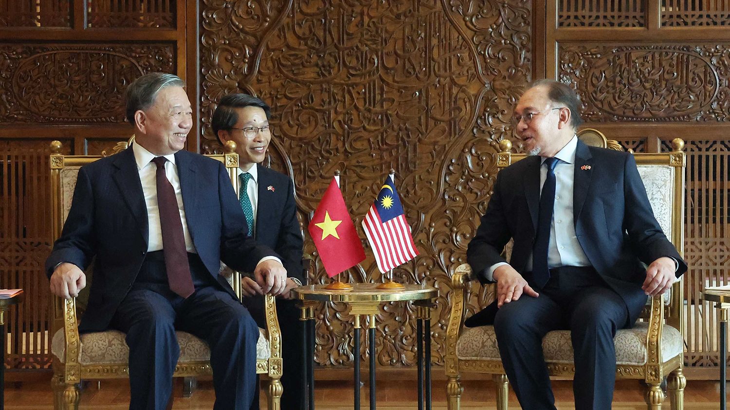 2024年11月21日,在越共中央总书记苏林对马来西亚进行正式访问框架内,双方同意将越马关系提升为全面战略伙伴关系。图为苏林总书记与马来西亚总理安瓦尔·易卜拉欣举行闭门会谈。(图片来源:越通社)