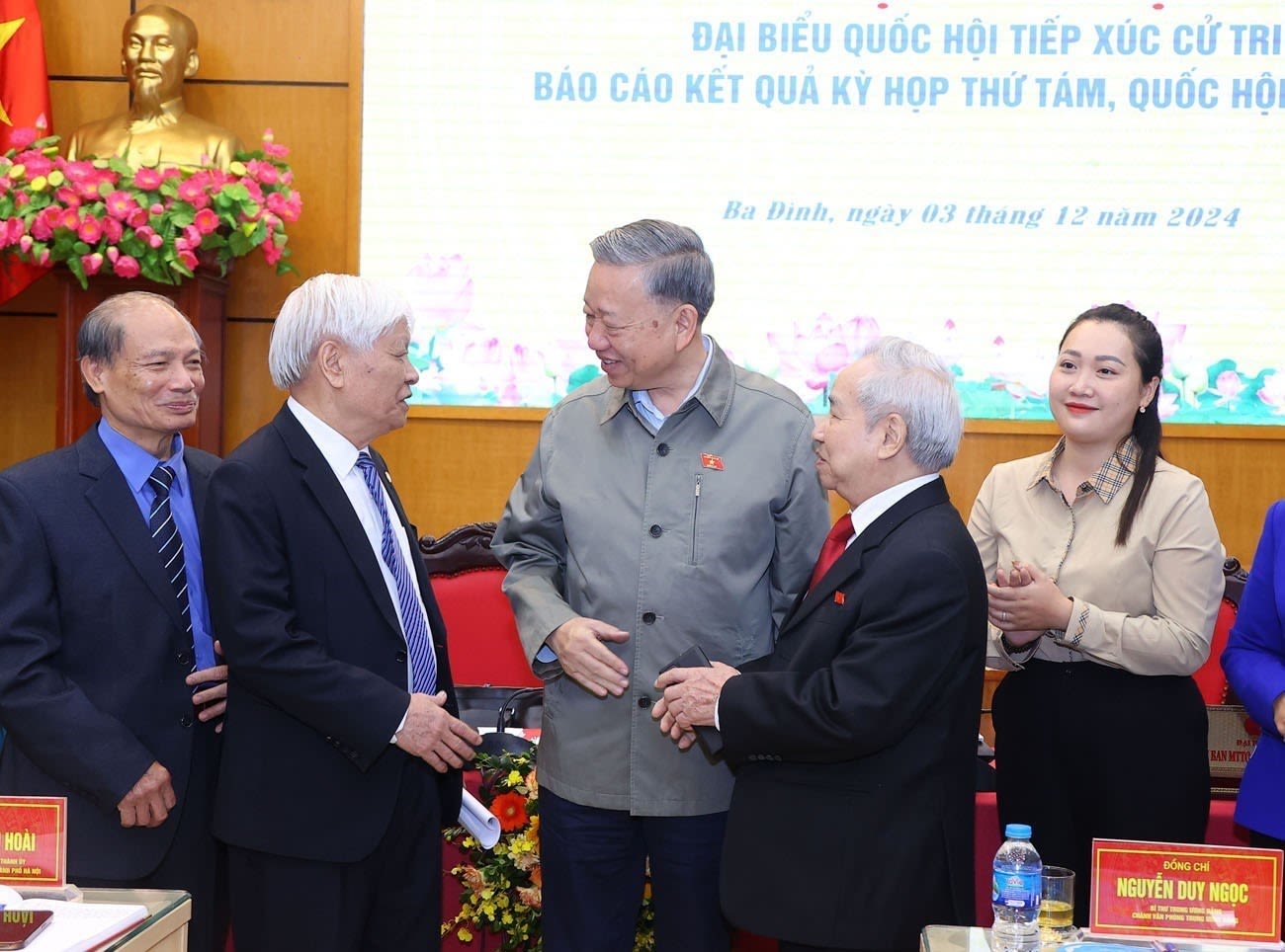 2024年12月3日,越共中央总书记苏林和河内市第一号选区国会代表在巴亭郡人民议会、人民委员会总部会见巴亭、栋多和二征夫人郡的选民,通报第十五届国会第八次会议结果,并听取选民的意见、建议。(图片来源:越通社)