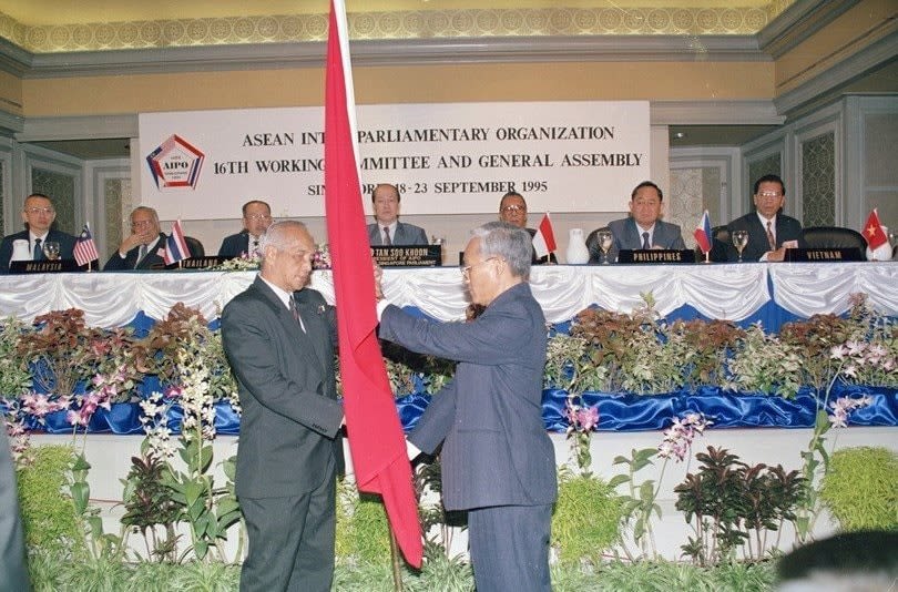 1995年9月19日,在东南亚国家联盟议会组织(AIPO,即AIPA前身)第一次全体大会上,越南国旗正式由观察员列席升至成员国旗帜之列。(图片来源:越通社)