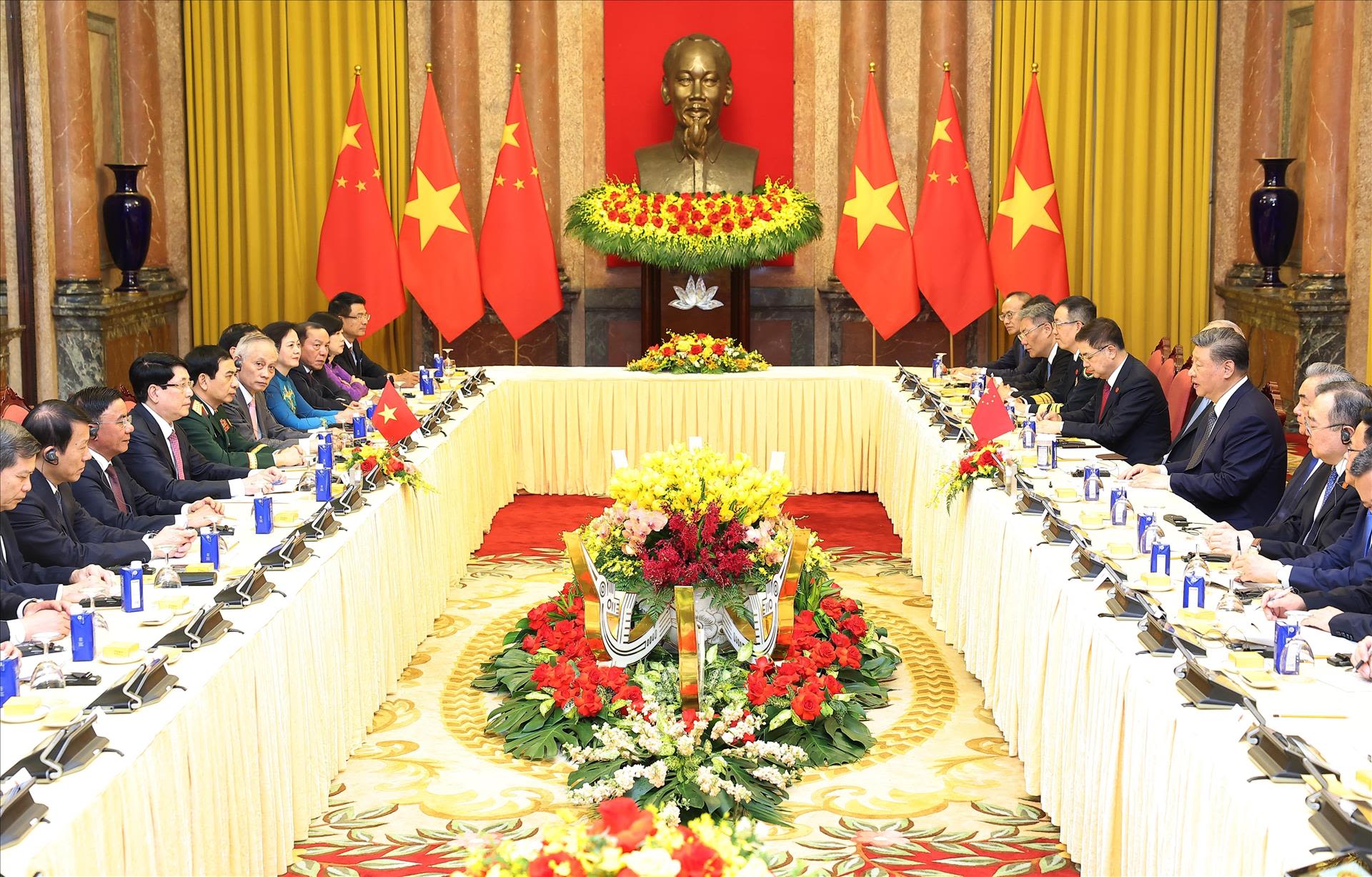 越南国家主席梁强于2025年4月15日在主席府与中共中央总书记、中国国家主席习近平举行会谈。(图片来源:越通社)