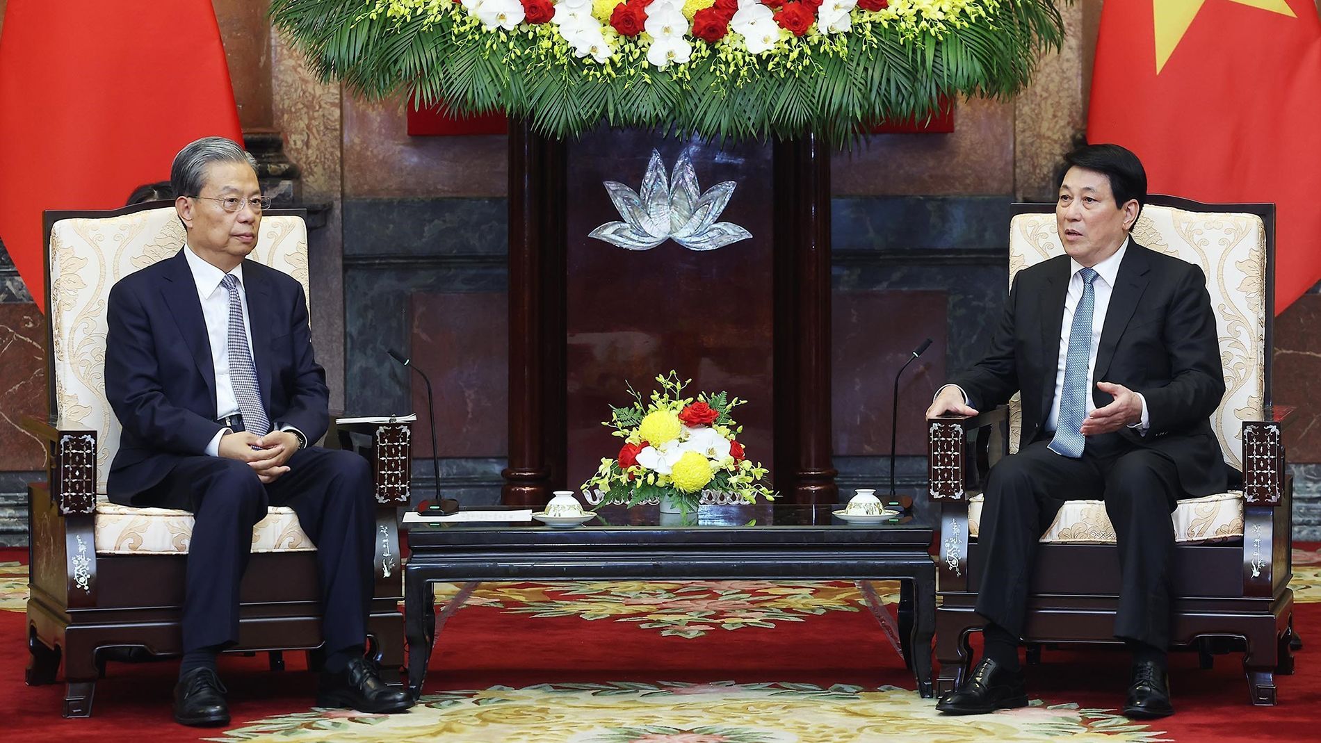 越南国家主席梁强于2025年9月1日会见赴越出席八月革命胜利暨国庆80周年庆典,并共同主持越南国会与中国全国人大联合委员会第一次会议的中共中央政治局常委、中国全国人大常委会委员长赵乐际。(图片来源:越通社)